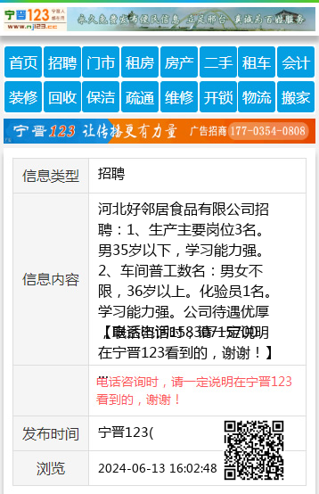 河北好邻居食品有限公司招聘:1、生产主要岗位3名。男35岁以下,学习能力强。2、车间普工数名:男女不限,36岁以上。化验员1名。学习能力强。公司待遇优厚,联系电话15830715700