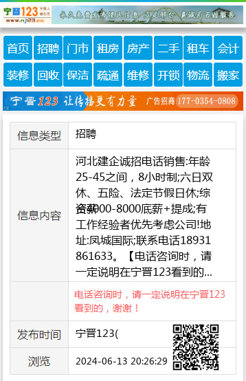 河北建企诚招电话销售:年龄25-45之间,8小时制;六日双休、五险、法定节假日休;综合薪