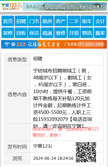 宁纺绒布招聘刷绒工(男,48周岁以下),割绒工(女,45周岁以下),常白班,10小时,提供午餐,工资前期不熟练每天补贴120元加计件金额,后期熟练计件工资4500-5500元,入职上三险15932092079 【电话咨询时,请一定说明在宁晋123看到的,谢谢!】 |