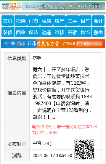 男六十,开了多年饭店,熟食店,干过食堂能炒菜技术全面身体健康,有C1驾照,想找份做饭,开车送货也行的活,有需要的联系我.18831987403 【电话咨询时,请一定说明在宁晋123看到的,谢谢!】 |