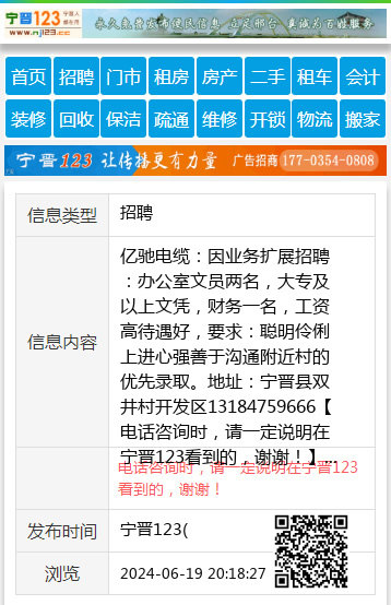 亿驰电缆:因业务扩展招聘:办公室文员两名,大专及以上文凭,财务一名,工资高待遇好,要求:聪明伶俐上进心强善于沟通附近村的优先录取。地址:宁晋县双井村开发区13184759666 【电话咨询时,请一定说明在宁晋123看到的,谢谢!】 |