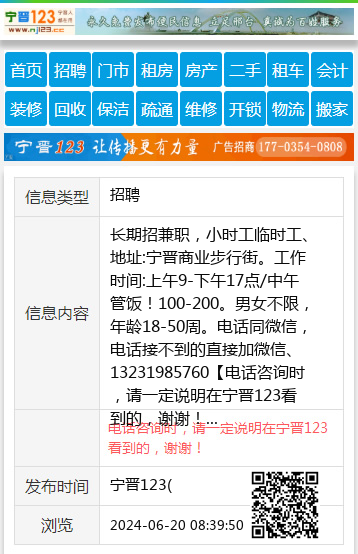长期招兼职,小时工临时工、地址:宁晋商业步行街。工作时间:上午9-下午17点/中午管饭!100-200。男女不限,年龄18-50周。电话同微信,电话接不到的直接加微信、13231985760 【电话咨询时,请一定说明在宁晋123看到的,谢谢!】 |