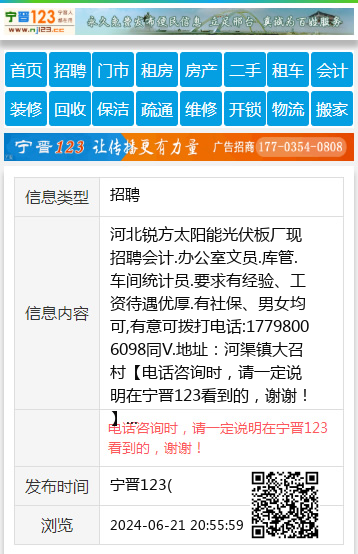 河北锐方太阳能光伏板厂现招聘会计.办公室文员.库管.车间统计员.要求有经验、工资待遇优厚.有社保、男女均可,有意可拨打电话:17798006098同V.地址:河渠镇大召村 【电话咨询时,请一定说明在宁晋123看到的,谢谢!】 |