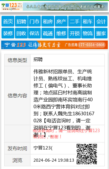 伟雅新材招跟单员、生产统计员、熟练绞丝工、机电维修工(偏电气)、董事长助理;地点延白村村南高端制造产业园即南环宾馆南行400米路西宁营体育斜对过即到;联系人魏先生18630167028 【电话咨询时,请一定说明在宁晋123看到的,谢谢!】 |