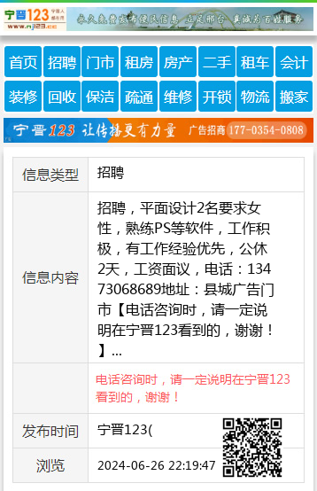 招聘,平面设计2名要求女性,熟练PS等软件,工作积极,有工作经验优先,公休2天,工资面议,电话:13473068689地址:县城广告门市 【电话咨询时,请一定说明在宁晋123看到的,谢谢!】 |