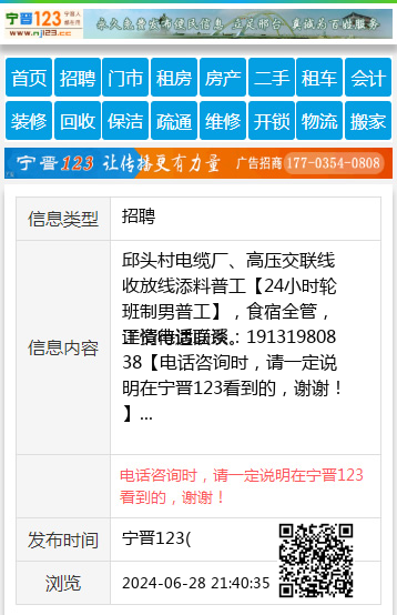 邱头村电缆厂、高压交联线收放线添料普工【24小时轮班制男普工】,食宿全管,工资待遇面谈。