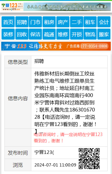 伟雅新材招长期倒丝工绞丝熟练工电气维修工跟单员生产统计员;地址延白村南工业园东南南环宾馆南行400米宁营体育斜对过路西即到;联系人魏先生18630167028 【电话咨询时,请一定说明在宁晋123看到的,谢谢!】 |