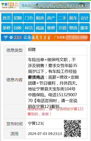 薪资待遇:底薪+绩效+定期团建+节日福利,月休四天。地址宁晋县天宝东街104号中路保险。电话15132900770 【电话咨询时,请一定说明在宁晋123看到的,谢谢!】 |