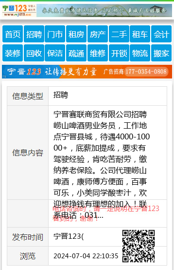 宁晋赛联商贸有限公司招聘崂山啤酒男业务员,工作地点宁晋县城,待遇4000-10000+,底薪加提成,要求有驾驶经验,肯吃苦耐劳,缴纳养老保险。公司代理崂山啤酒,康师傅方便面,百事可乐,小美同学酸枣汁,欢迎想挣钱有理想的加入!联系电话:0319-3665555,15227337923洪经理 【电话咨询时,请一定说明在宁晋123看到的,谢谢!】 |