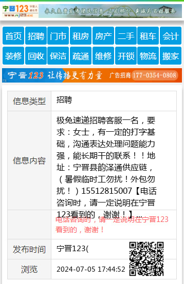 极兔速递招聘客服一名,要求:女士,有一定的打字基础,沟通表达处理问题能力强,能长期干的联系!!地址:宁晋县韵泽通供应链,(暑假临时工勿扰!外包勿扰!)15512815007 【电话咨询时,请一定说明在宁晋123看到的,谢谢!】 |