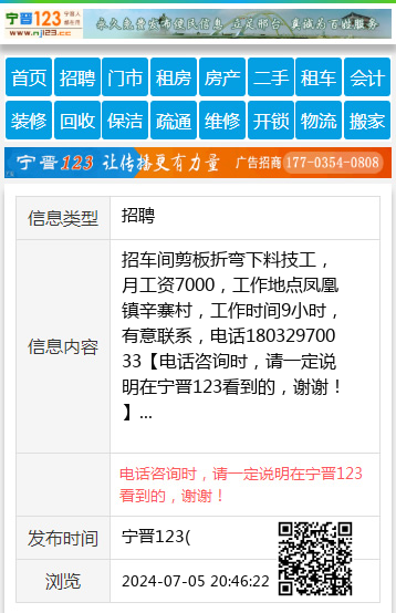 招车间剪板折弯下料技工,月工资7000,工作地点凤凰镇辛寨村,工作时间9小时,有意联系,电话18032970033 【电话咨询时,请一定说明在宁晋123看到的,谢谢!】 |