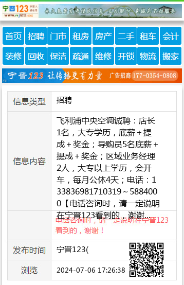 飞利浦中央空调诚聘:店长1名,大专学历,底薪+提成+奖金;导购员5名底薪+提成+奖金;区域业务经理2人,大专以上学历,会开车,每月公休4天;电话:133836981710319~5884000 【电话咨询时,请一定说明在宁晋123看到的,谢谢!】 |