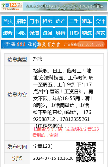 招兼职、日工、临时工!地址:方法科技园。工作时间:周一至周五,上午9点-下午17点/中午管饭!工资日结。男女不限,年龄18-55周,满18周岁。电话同微信,电话接不到的直接加微信。 17692988712,17812355261 【电话咨询时,请一定说明在宁晋123看到的,谢谢!】 |
