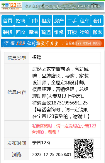 居然之家宁晋商场,高薪诚聘:品牌店长,导购,家装设计师,全屋定制设计师。楼层经理,营销经理,总经理助理(大专及以上学历)。待遇面议18731995691..25 【电话咨询时,请一定说明在宁晋123看到的,谢谢!】 |
