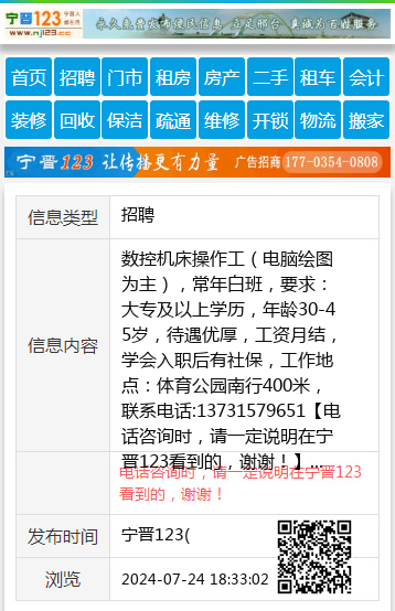 数控机床操作工(电脑绘图为主),常年白班,要求:大专及以上学历,年龄30-45岁,待遇优厚,工资月结,学会入职后有社保,工作地点:体育公园南行400米,联系电话:13731579651 【电话咨询时,请一定说明在宁晋123看到的,谢谢!】 |