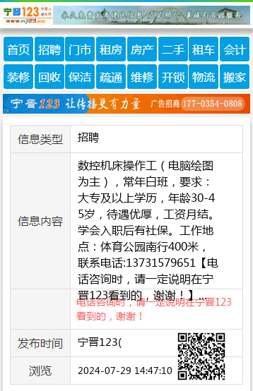 数控机床操作工(电脑绘图为主),常年白班,要求:大专及以上学历,年龄30-45岁,待遇优厚,工资月结。学会入职后有社保。工作地点:体育公园南行400米,联系电话:13731579651 【电话咨询时,请一定说明在宁晋123看到的,谢谢!】 |