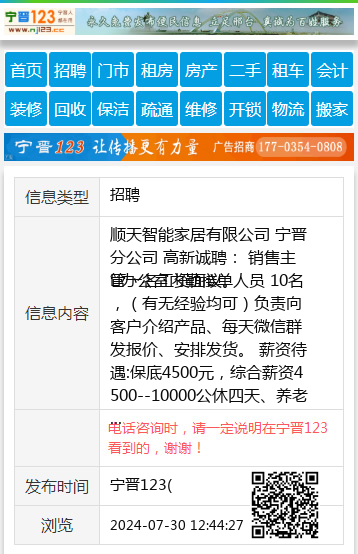 顺天智能家居有限公司 宁晋分公司 高新诚聘: 销售主管一名工资面议。