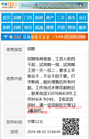招聘电商客服,工资入职四千起,试用期一周,试用期工资一天一百二,要求上手就会干,不会干的不要。打字熟练,能处理售后所有问题。工作地点水榭花都附近,联系电话15076866309.工作时长8-9小时。 【电话咨询时,请一定说明在宁晋123看到的,谢谢!】 |