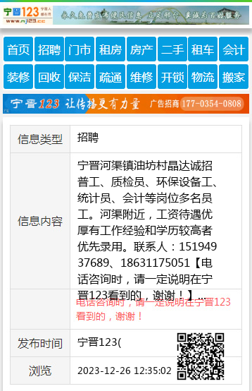 宁晋河渠镇油坊村晶达诚招普工、质检员、环保设备工、统计员、会计等岗位多名员工。河渠附近,工资待遇优厚有工作经验和学历较高者优先录用。联系人:15194937689、18631175051 【电话咨询时,请一定说明在宁晋123看到的,谢谢!】 |