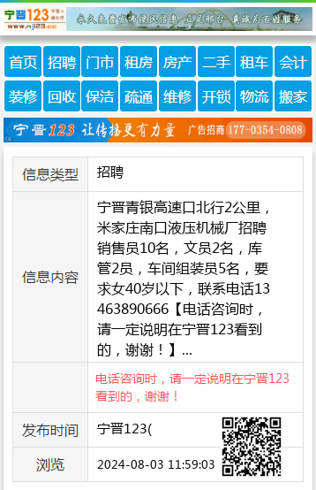 宁晋青银高速口北行2公里,米家庄南口液压机械厂招聘销售员10名,文员2名,库管2员,车间组装员5名,要求女40岁以下,联系电话13463890666 【电话咨询时,请一定说明在宁晋123看到的,谢谢!】 |