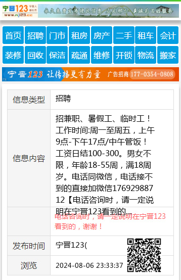 招兼职、暑假工、临时工!工作时间:周一至周五,上午9点-下午17点/中午管饭!工资日结100-300。男女不限,年龄18-55周,满18周岁。电话同微信,电话接不到的直接加微信17692988712 【电话咨询时,请一定说明在宁晋123看到的,谢谢!】 |