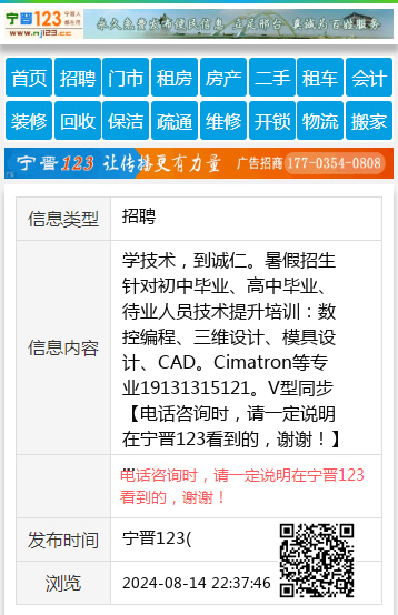 学技术,到诚仁。暑假招生针对初中毕业、高中毕业、待业人员技术提升培训:数控编程、三维设计、模具设计、CAD。Cimatron等专业19131315121。V型同步 【电话咨询时,请一定说明在宁晋123看到的,谢谢!】 |