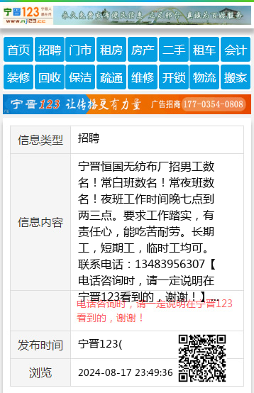 宁晋恒国无纺布厂招男工数名!常白班数名!常夜班数名!夜班工作时间晚七点到两三点。要求工作踏实,有责任心,能吃苦耐劳。长期工,短期工,临时工均可。联系电话:13483956307 【电话咨询时,请一定说明在宁晋123看到的,谢谢!】 |