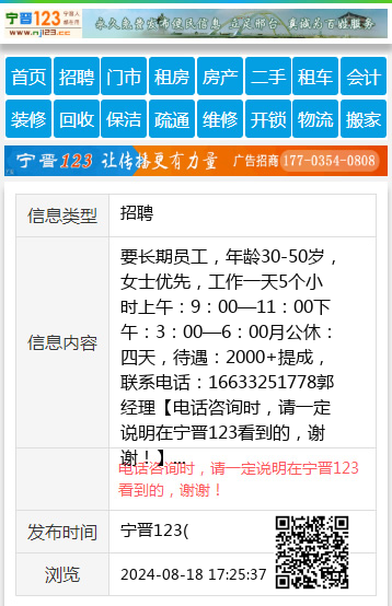 要长期员工,年龄30-50岁,女士优先,工作一天5个小时上午:9:00—11:00下午:3:00—6:00月公休:四天,待遇:2000+提成,联系电话:16633251778郭经理 【电话咨询时,请一定说明在宁晋123看到的,谢谢!】 |