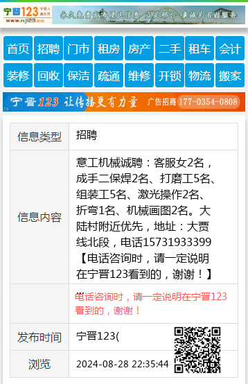意工机械诚聘:客服女2名,成手二保焊2名、打磨工5名、组装工5名、激光操作2名、折弯1名、机械画图2名。大陆村附近优先,地址:大贾线北段,电话15731933399 【电话咨询时,请一定说明在宁晋123看到的,谢谢!】 |