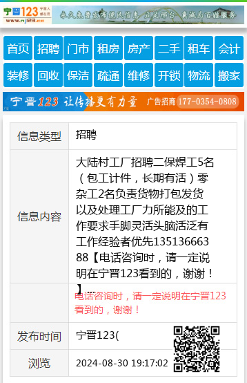 | 防骗提醒: | 宁晋123(www.nj123.cc)提醒您:手工活、网络兼职、刷单,都是骗子!凡以各种名义收取费用的都是骗子!找工作是往兜里挣钱,让你往外掏钱的都是骗子!异地招聘请提高警惕,谨防诈骗! |