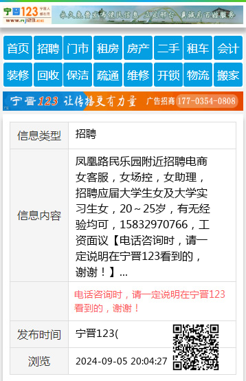 凤凰路民乐园附近招聘电商女客服,女场控,女助理,招聘应届大学生女及大学实习生女,20~25岁,有无经验均可,15832970766,工资面议 【电话咨询时,请一定说明在宁晋123看到的,谢谢!】 |