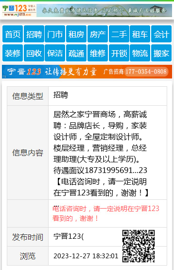 居然之家宁晋商场,高薪诚聘:品牌店长,导购,家装设计师,全屋定制设计师。楼层经理,营销经理,总经理助理(大专及以上学历)。待遇面议18731995691...23 【电话咨询时,请一定说明在宁晋123看到的,谢谢!】 |