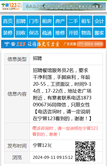 招聘餐馆服务员2名,要求干净利落,手脚麻利,年龄20-55,工资面议,时间9-14点,17-22点,地址老广场附近,有意者联系电话18730906736同微信,只限女性 【电话咨询时,请一定说明在宁晋123看到的,谢谢!】 |