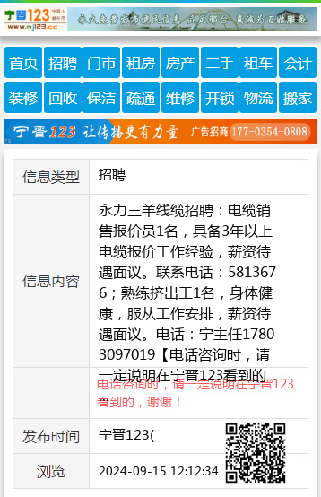 永力三羊线缆招聘:电缆销售报价员1名,具备3年以上电缆报价工作经验,薪资待遇面议。联系电话:5813676;熟练挤出工1名,身体健康,服从工作安排,薪资待遇面议。电话:宁主任17803097019 【电话咨询时,请一定说明在宁晋123看到的,谢谢!】 |