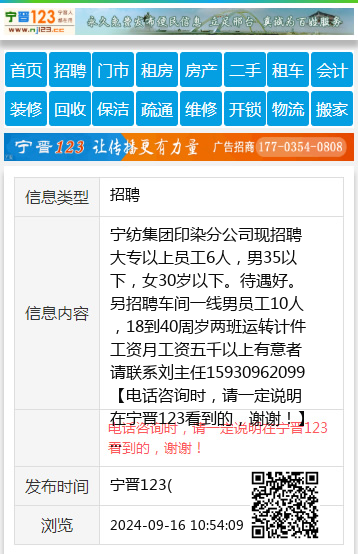 宁纺集团印染分公司现招聘大专以上员工6人,男35以下,女30岁以下。待遇好。另招聘车间一线男员工10人,18到40周岁两班运转计件工资月工资五千以上有意者请联系刘主任15930962099 【电话咨询时,请一定说明在宁晋123看到的,谢谢!】 |