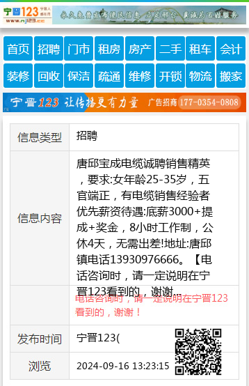 唐邱宝成电缆诚聘销售精英,要求:女年龄25-35岁,五官端正,有电缆销售经验者优先薪资待遇:底薪3000+提成+奖金,8小时工作制,公休4天,无需出差!地址:唐邱镇电话13930976666。 【电话咨询时,请一定说明在宁晋123看到的,谢谢!】 |