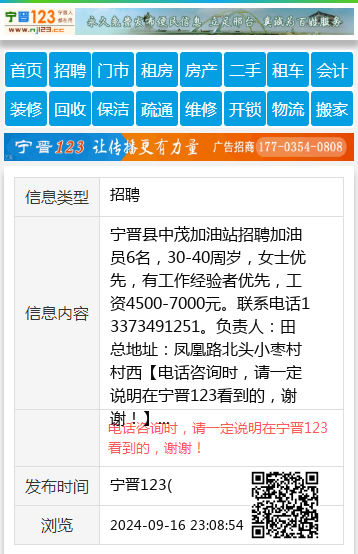宁晋县中茂加油站招聘加油员6名,30-40周岁,女士优先,有工作经验者优先,工资4500-7000元。联系电话13373491251。负责人:田总地址:凤凰路北头小枣村村西 【电话咨询时,请一定说明在宁晋123看到的,谢谢!】 |
