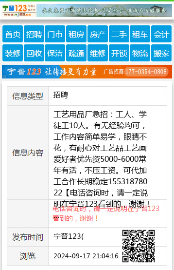 工艺用品厂急招:工人、学徒工10人。有无经验均可,工作内容简单易学,眼睛不花,有耐心对工艺品工艺画爱好者优先资5000-6000常年有活,不压工资。可代加工合作长期稳定15531878022 【电话咨询时,请一定说明在宁晋123看到的,谢谢!】 |