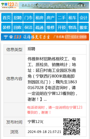 伟雅新材招熟练框绞工、电工、质检员、销售统计;地址:延白村南工业园区东南角(宁联西行800米路南即到园区北门);魏先生18630167028 【电话咨询时,请一定说明在宁晋123看到的,谢谢!】 |