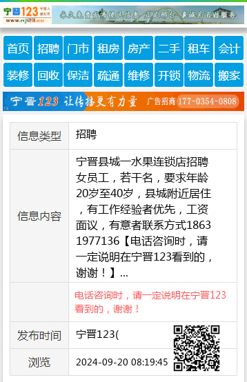宁晋县城一水果连锁店招聘女员工,若干名,要求年龄20岁至40岁,县城附近居住,有工作经验者优先,工资面议,有意者联系方式18631977136 【电话咨询时,请一定说明在宁晋123看到的,谢谢!】 |