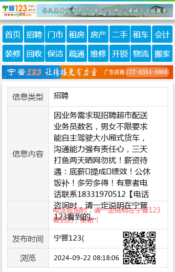 因业务需求现招聘超市配送业务员数名,男女不限要求能自主驾驶大小厢式货车,沟通能力强有责任心,三天打鱼两天晒网勿扰!薪资待遇:底薪➕提成➕绩效!公休饭补!多劳多得!有意者电话联系18331970512 【电话咨询时,请一定说明在宁晋123看到的,谢谢!】 |