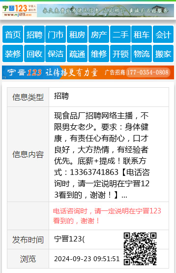 现食品厂招聘网络主播,不限男女老少。要求:身体健康,有责任心有耐心,口才良好,大方热情,有经验者优先。底薪+提成!联系方式:13363741863 【电话咨询时,请一定说明在宁晋123看到的,谢谢!】 |