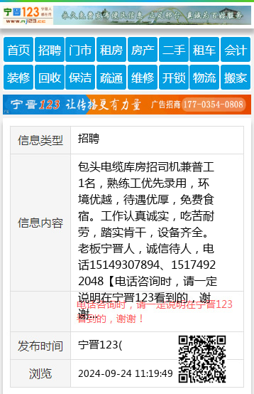 包头电缆库房招司机兼普工1名,熟练工优先录用,环境优越,待遇优厚,免费食宿。工作认真诚实,吃苦耐劳,踏实肯干,设备齐全。老板宁晋人,诚信待人,电话15149307894、15174922048 【电话咨询时,请一定说明在宁晋123看到的,谢谢!】 |