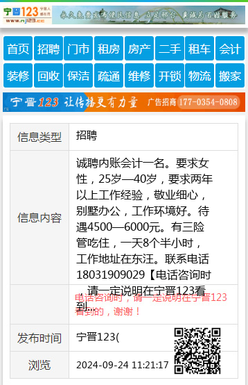 诚聘内账会计一名。要求女性,25岁—40岁,要求两年以上工作经验,敬业细心,别墅办公,工作环境好。待遇4500—6000元。有三险管吃住,一天8个半小时,工作地址在东汪。联系电话18031909029 【电话咨询时,请一定说明在宁晋123看到的,谢谢!】 |