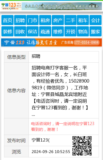 招聘电商打字客服一名,平面设计师一名,女,长白班,有经验者优先,150289009819(微信同步),工作地址:宁晋县城晶龙宾馆附近 【电话咨询时,请一定说明在宁晋123看到的,谢谢!】 |