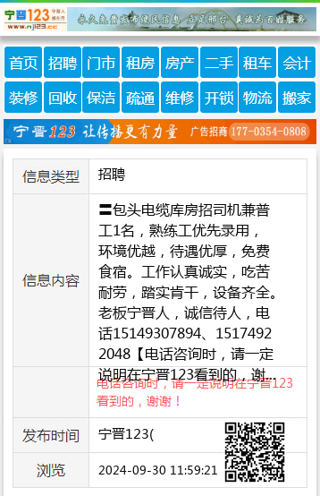 〓包头电缆库房招司机兼普工1名,熟练工优先录用,环境优越,待遇优厚,免费食宿。工作认真诚实,吃苦耐劳,踏实肯干,设备齐全。老板宁晋人,诚信待人,电话15149307894、15174922048 【电话咨询时,请一定说明在宁晋123看到的,谢谢!】 |