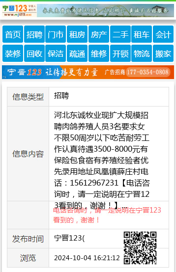 河北东诚牧业现扩大规模招聘肉鸽养殖人员3名要求女不限50周岁以下吃苦耐劳工作认真待遇3500-8000元有保险包食宿有养殖经验者优先录用地址凤凰镇薛庄村电话:15612967231 【电话咨询时,请一定说明在宁晋123看到的,谢谢!】 |