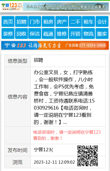办公室文员,女,打字熟练,会一般软件操作,八小时工作制,会PS优先考虑,免费食宿,宁晋纪昌庄镇清善桥村,工资待遇联系电话:15030929616 【电话咨询时,请一定说明在宁晋123看到的,谢谢!】 |