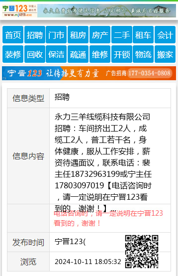 永力三羊线缆科技有限公司招聘:车间挤出工2人,成缆工2人,普工若干名,身体健康,服从工作安排,薪资待遇面议,联系电话:裴主任18732963199或宁主任17803097019 【电话咨询时,请一定说明在宁晋123看到的,谢谢!】 |