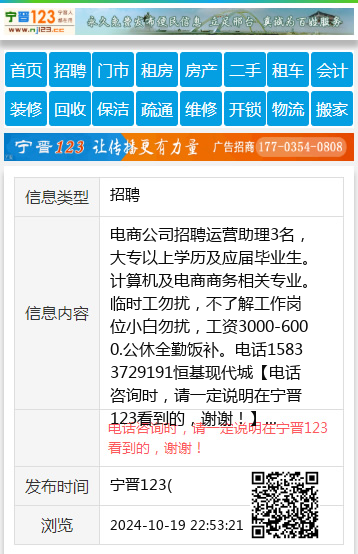 电商公司招聘运营助理3名,大专以上学历及应届毕业生。计算机及电商商务相关专业。临时工勿扰,不了解工作岗位小白勿扰,工资3000-6000.公休全勤饭补。电话15833729191恒基现代城 【电话咨询时,请一定说明在宁晋123看到的,谢谢!】 |